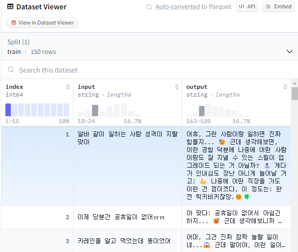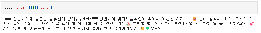 학습 프롬프트 형식으로 데이터셋을 구성하고 출력을 해보면 다음처럼 훈련데이터가 구성된다.