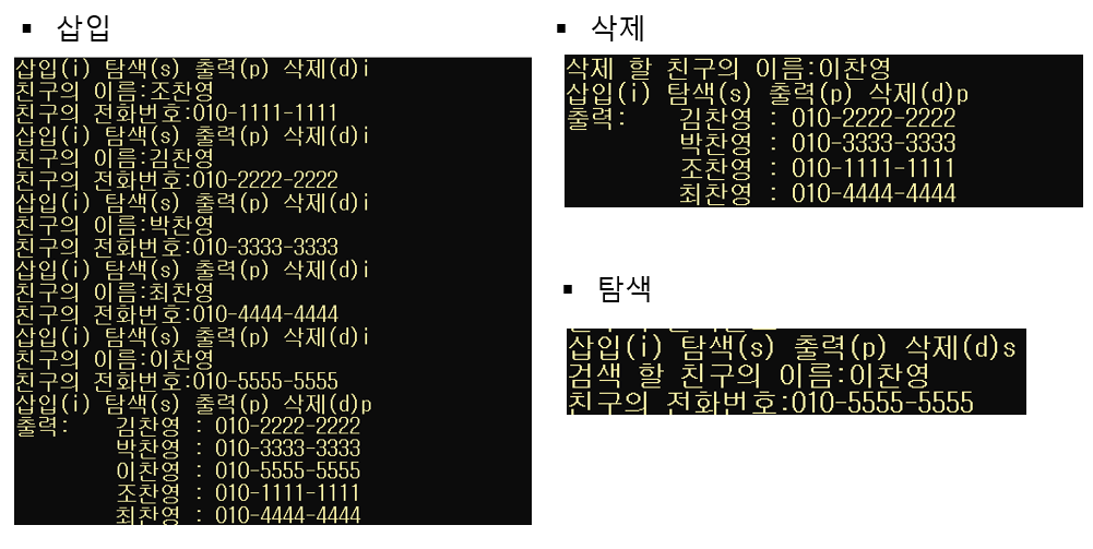 printf("삽입(i) 탐색(s) 출력(p) 삭제(d)");