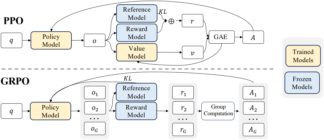- 일반적인 RL: policy 모델 + value 모델 → 연산 비용 높음