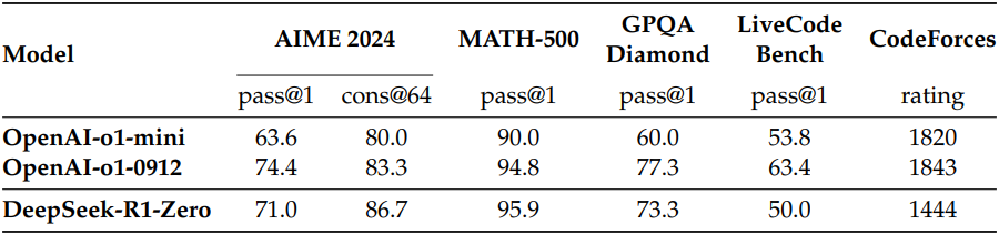 다음은 DeepSeek-R1-Zero와 OpenAI의 o1-0912 모델을 다양한 추론 벤치마크에서 비교한 표이다.