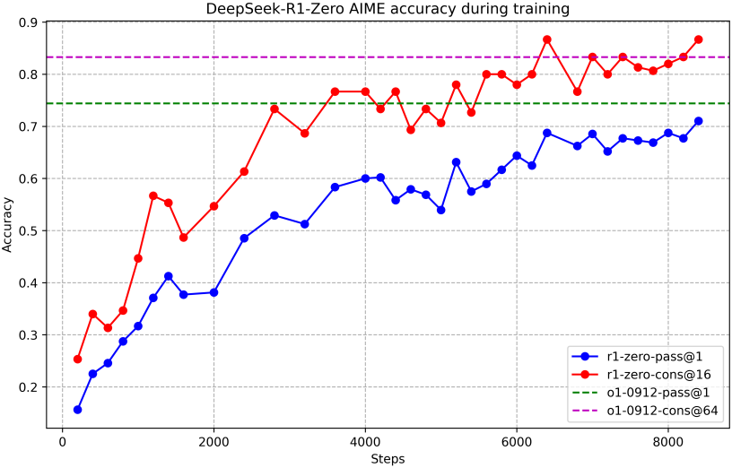 다음은 학습이 진행됨에 따라 DeepSeek-R1-Zero의 AIME 정확도의 변화를 나타낸 그래프이다.