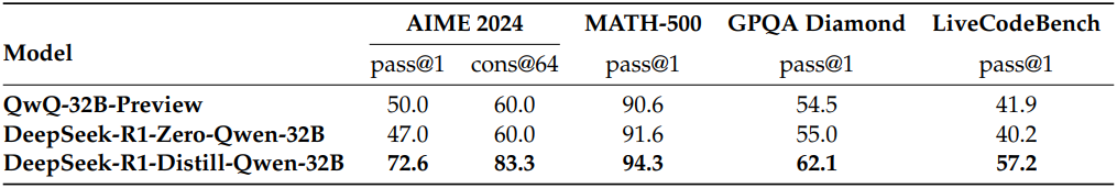 - Qwen2.5-32B를 기반으로 distillation → RL보다 성능 우수