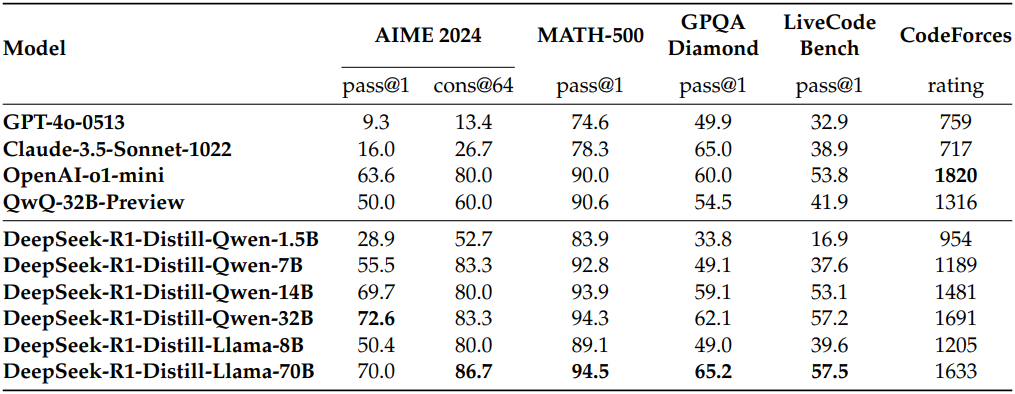 다음은 DeepSeek-R1에서 distillation된 모델들을 다른 모델들과 비교한 결과이다.