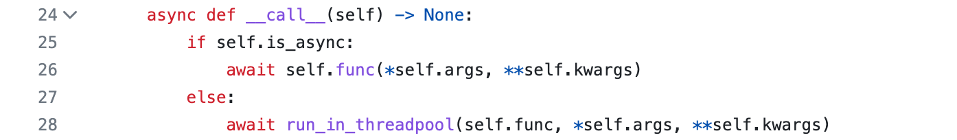 파이썬의 웹 프레임워크인 Starlette 에서 위의 내용을 확인할 수 있습니다. 경로로 지정되어 호출되는 함수가 async def 라면 코루틴을 통해서, def 라면 외부의 스레드 풀을 사용해서 작업을 처리하고 이를 await 하죠. 먼저 응답을 보내고 실행하기 위한 Background tasks도 마찬가지 입니다.
