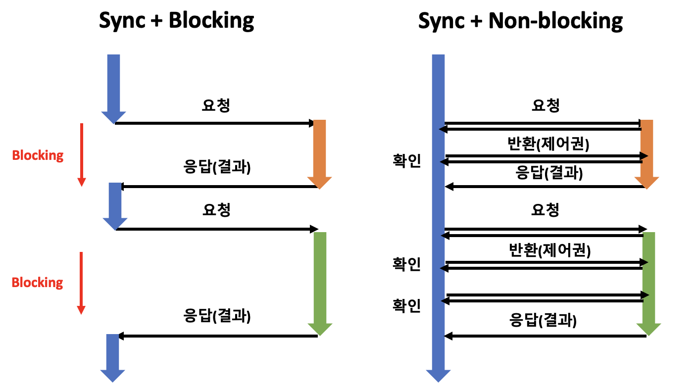 정리하자면 Blocking/Non-blocking 은 제어에 관점을 두는 것이고 Sync/Async 는 순서에 관점을 두는 것입니다. 이를 통해서 총 4가지의 조합이 나올 수 있는데요. 하나씩 알아보도록 합시다. 먼저 Sync 를 기준으로 알아보도록 하겠습니다.