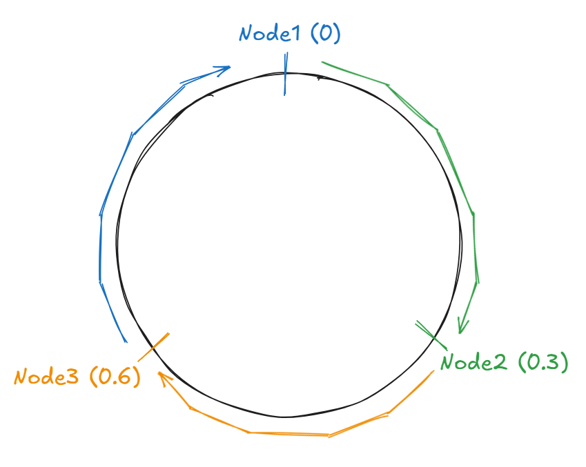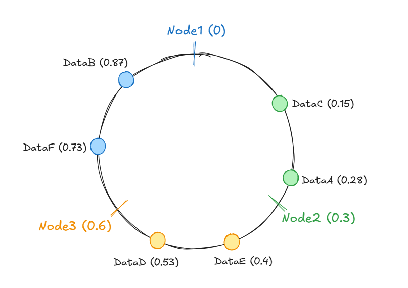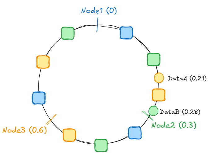 좀 감이 안올 수 있는데, 또 예시를 들어보자. 데이터를 저장할 Node는 hash 값 이사의 값들 중 제일 가까운 값을 가지는 Node라고 하자. 그러면 아래의 사진처럼 해당 범위에 오는 데이터들은 같은 색깔을 가지는 노드에 저장된다는 것을 의미한다.