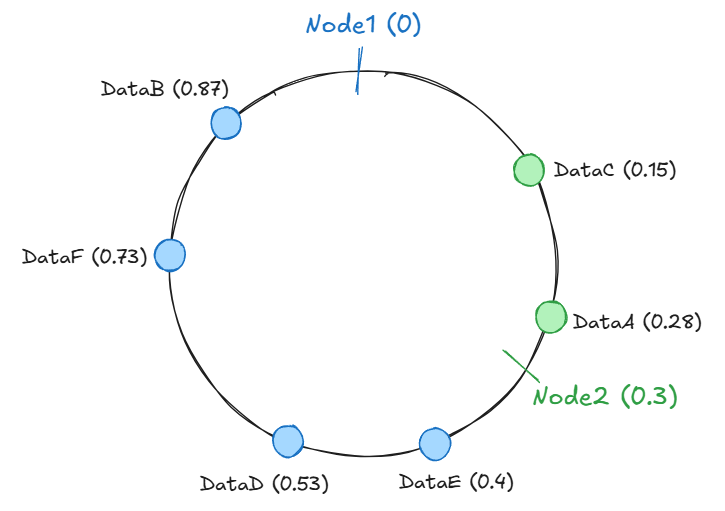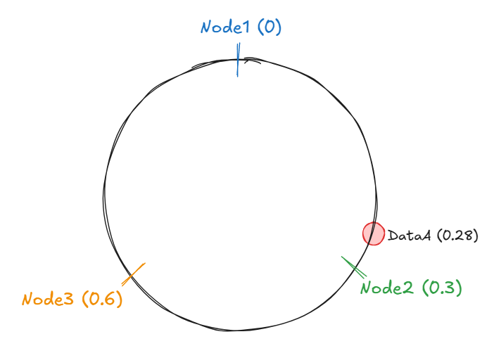 저장할 값(DataA)을 hash 함수로 돌렸을 때, 결과가 0.28이 나왔다. 그러면 아래 그림처럼 Node2 근처에 위치할 수 있을 것이다.