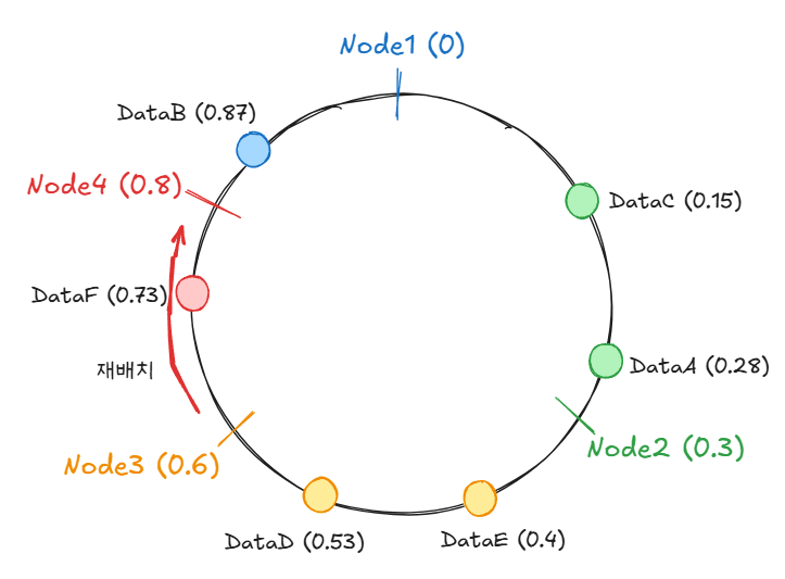 그럼 반대로 Node가 추가되는 상황을 생각해보자. Node 4(0.8) 이 추가되었다. 그럼 일반 hash를 사용할 때의 문제처럼 모든 데이터들이 재배치되어야할까? 그림을 보면 알 수 있듯, 아니다! 이번에도 마찬가지로 특정 데이터들만 재배치되면 된다. 여기서는 새로 추가되는 Node의 hash값 이하 범위들의 데이터들만 재배치 되면 된다.