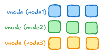 아래 그림에서처럼 각 Node마다 vnode가 6개씩 존재하는 상황이다. 그럼 이 vnode를 무작위로 범위 내에 뿌려놓는다.