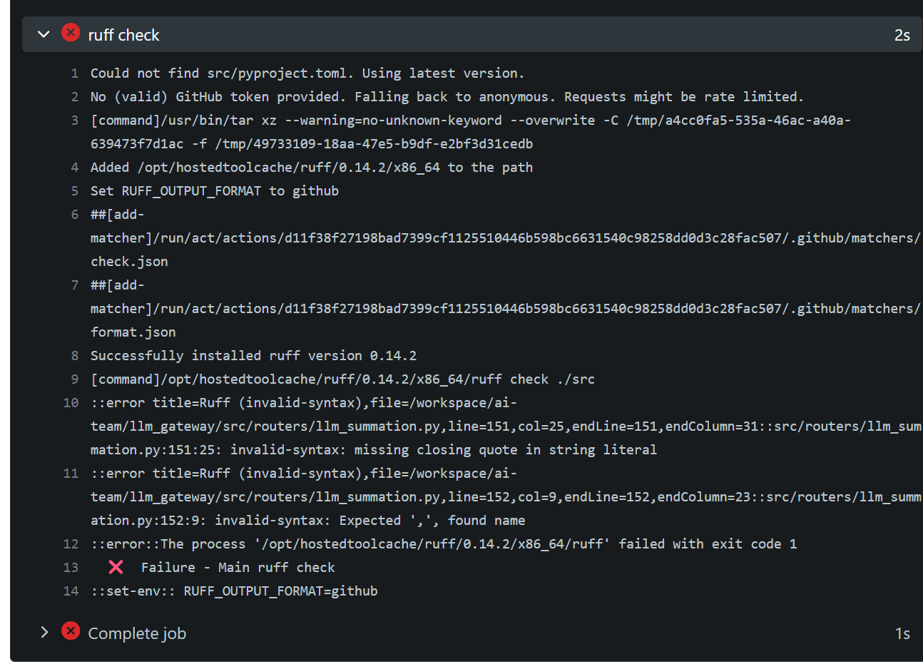Ruff 검사 실패(exit code 1)로 워크플로우가 실패 처리됨.