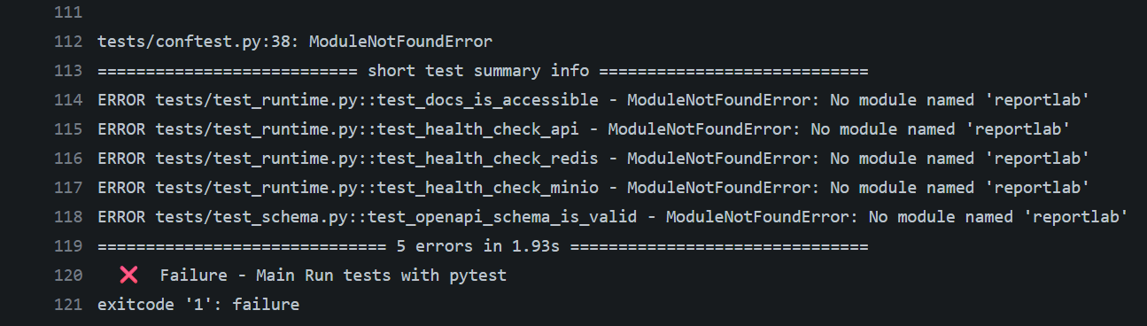 내가 컷밋한 업데이트 내용에서는 테스트 과정을 추가했는데 그때 추가한 모듈이 있다. reportlab라는 모듈인데 PDF를 생성해주는 모듈이다. 이걸 로컬에서 설치하고 만족했지만, CI에서는 필수 라이브러리가 누락됐다.