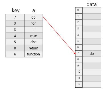 a 테이블은 밸류값이 들어가 있고 각 값들을 이스크 코드값으로 변환시켜 키값을 만든다. 만든 키값에 테이블 사이즈만큼 나눠줘 진짜 키값을 만들어준다.