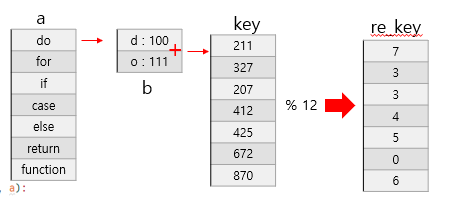 a 테이블은 밸류값이 들어가 있고 각 값들을 이스크 코드값으로 변환시켜 키값을 만든다. 만든 키값에 테이블 사이즈만큼 나눠줘 진짜 키값을 만들어준다.