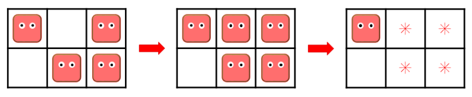 네모는 뿌××× 게임에 깊은 감명을 받아, 직사각형 모양의 격자판과 “넴모”라는 수수께끼의 생물을 이용하는 “넴모넴모”라는 게임을 만들었다. 이 게임의 규칙은 아주 간단하다. 격자판의 비어 있는 칸을 임의로 골라 “넴모”를 하나 올려놓거나, “넴모”가 올라간 칸 네 개가 2 × 2 사각형을 이루는 부분을 찾아 그 위에 있는 “넴모”들을 모두 없애는 것을 질릴 때까지 반복하면 된다.