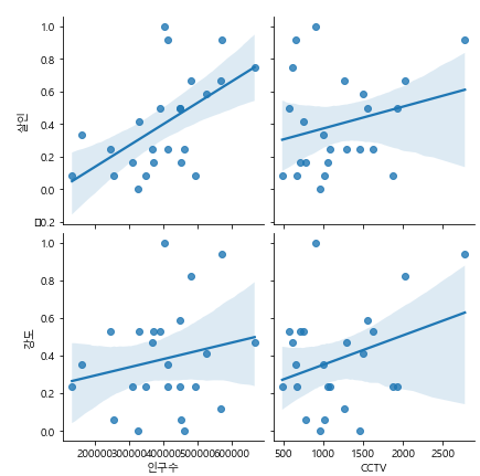 y_vars=["살인", "강도"], kind='reg', size=3)