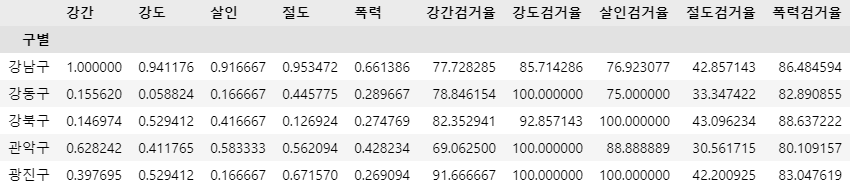 col = ['강간검거율','강도검거율','살인검거율','절도검거율','폭력검거율']