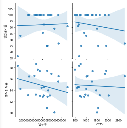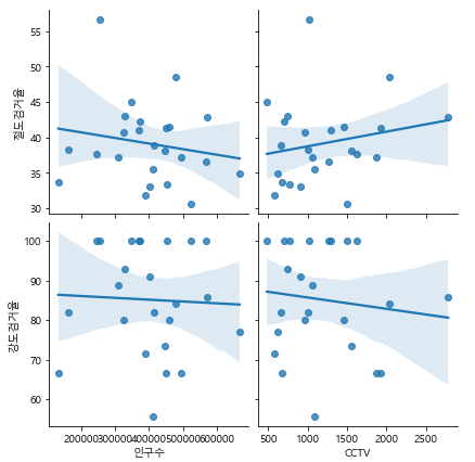 y_vars=["살인검거율", "폭력검거율"], kind='reg', size=3)