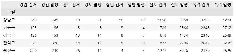 col = ['살인 검거', '강도 검거', '강간 검거', '절도 검거', '폭력 검거']