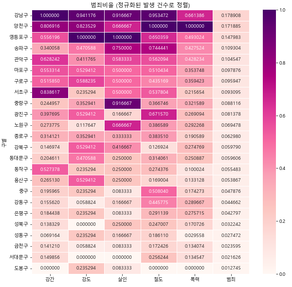 plt.title('범죄비율 (정규화된 발생 건수로 정렬)')
