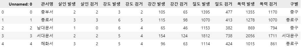 crime_anal_raw = pd.read_csv('../data/02. crime_in_Seoul_include_gu_name.csv',