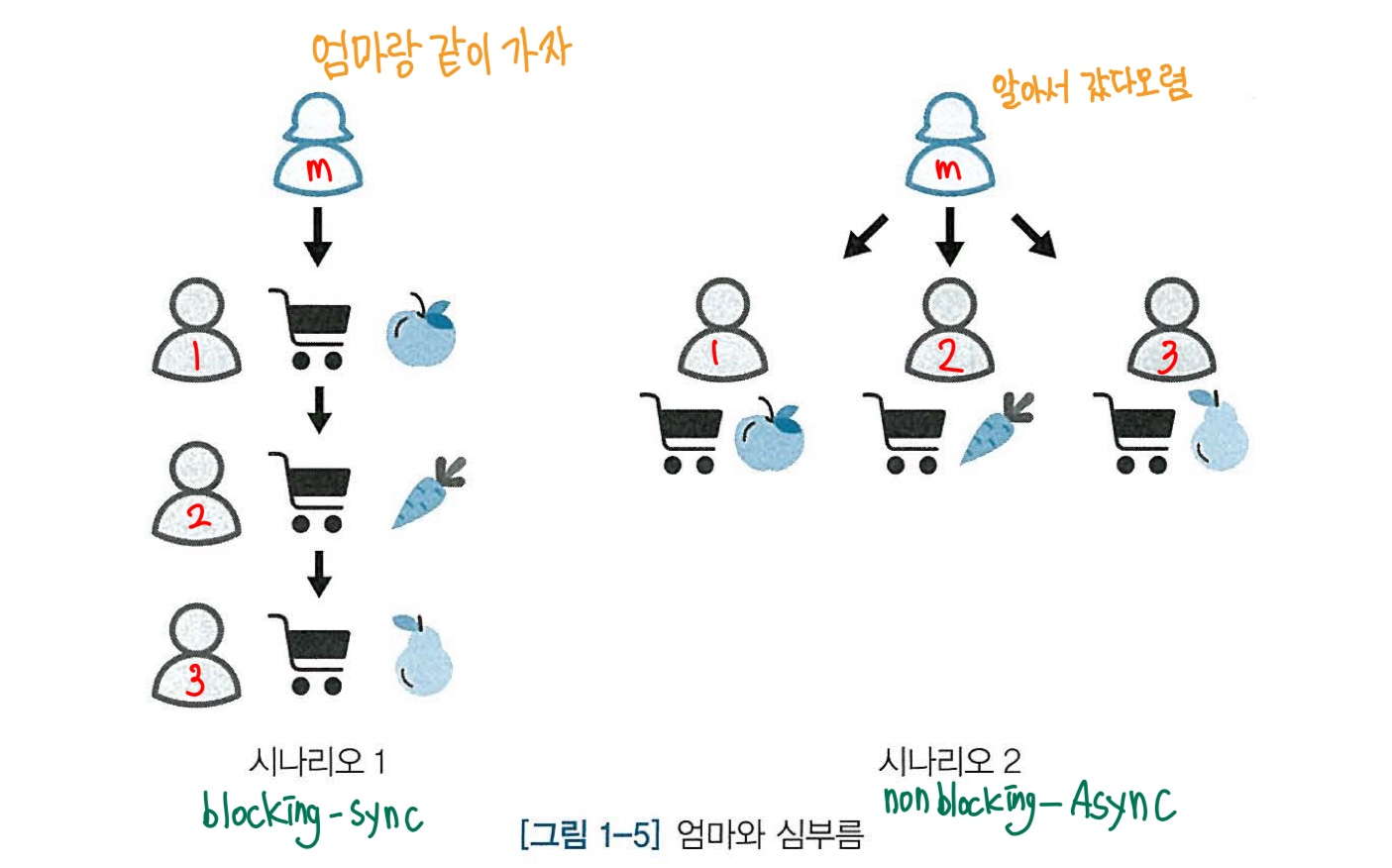 - 시나리오 1에서 엄나는 카트를 한개만 가지고 아이 한 명의 심부름이 끝날 때까지 다른 아이게게 심부름할 기회를 주지 않는다. 바로 이렇게 제어권을 넘겨 주지않고 대기하게 만드는 것을 블로킹(Bloking) 방식이라고 한다. 또 아이들에게 한 명씩 심부름을 시켰는데 이는 작업의 흐름이 순차적인 동기적 방식이다.