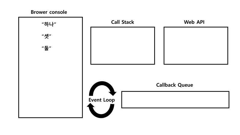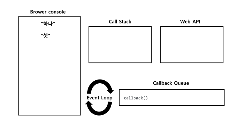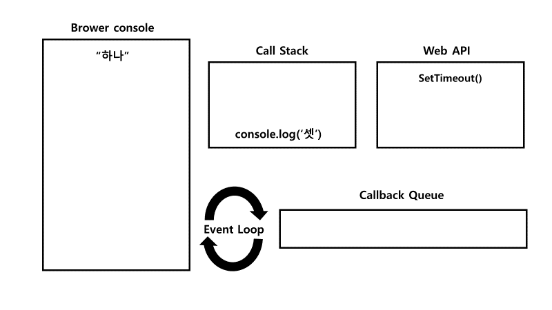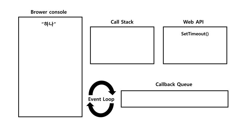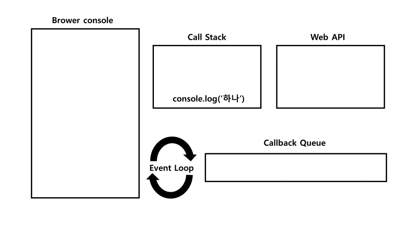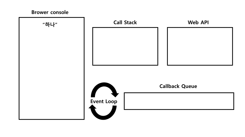 console.log(‘하나’)가 실행되어 화면에 출력된 뒤, Call Stack에서 pop