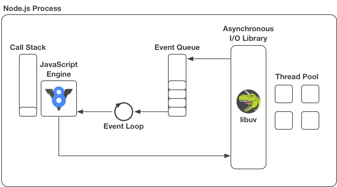 이 부분부터가 어려운데 쉽게 생각하면 Node.js 이벤트 주도, 논 블로킹 방식을 지원하고 싱글 스레드로 동작하며 libuv통해 시스템 커널에 작업을 위임하여 비동기 작업을 진행한다.