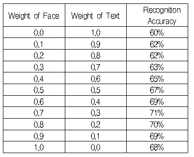 얼굴 가중치가 0.7 일때 정확도가 제일 높을것을 확인할 수 있습니다. 이는 얼굴 감정을 사용했을 때 65% 텍스트 감정을 사용했을 때 60% 보다 향상된 인식률을 보여줍니다.