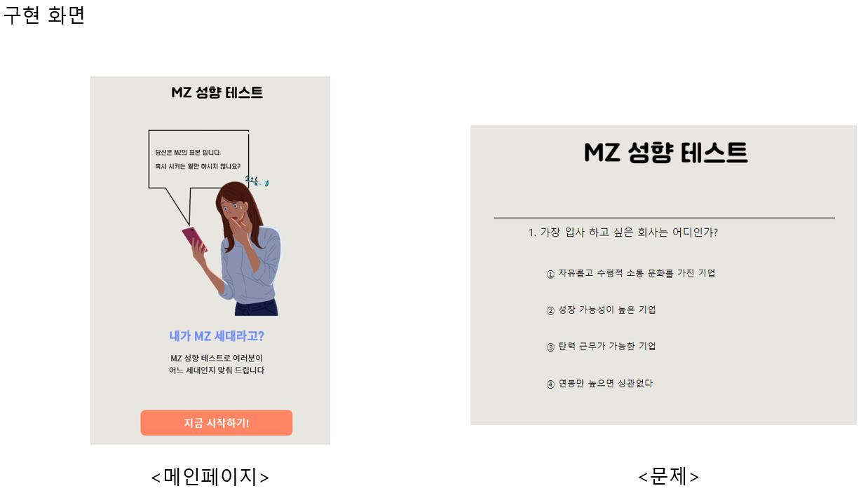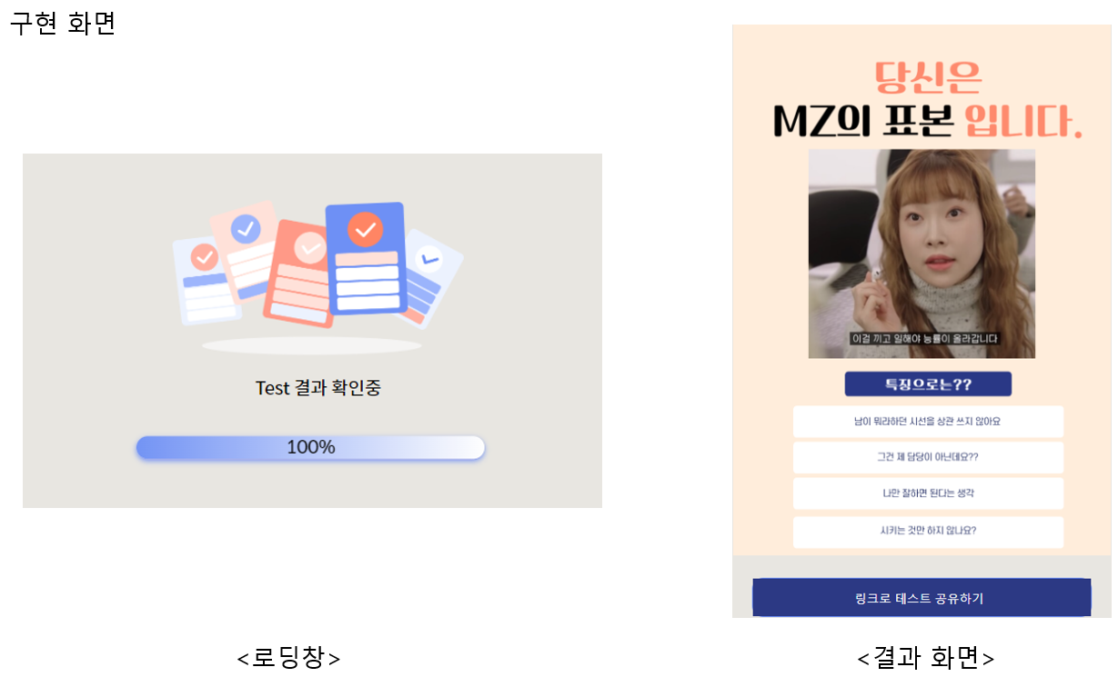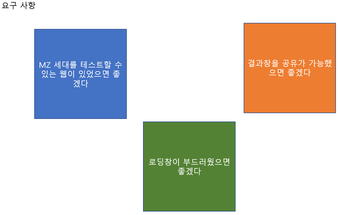 요구 사항을 수집하여 분석한 결과 MZ 세대를 테스트할 수 있는 웹이 있었으면 좋겠으며, 로딩창, 결과창 공유가 가능했으면 좋겠다는 요구를 받았다.