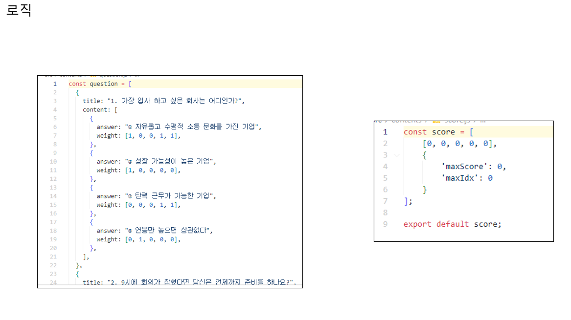 그럼 어떻게 결과를 계산하냐가 이 프로젝트에서 문제였는데 문제 마다 가중치를 적용하여 최종 결과를 누르면 결과 점수가 제일 높은 인덱스를 반환해주는 로직으로 함수를 작성했다.