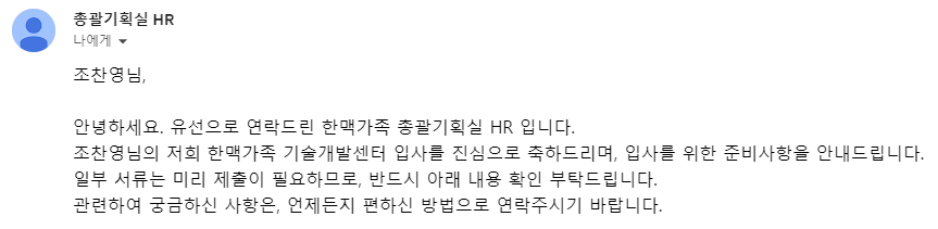 마침 구직시장을 돌아보던 와중 저의 직무와 관련된 채용을 찾았고 서류통과와 면접을 보고 나서 1주일 뒤...