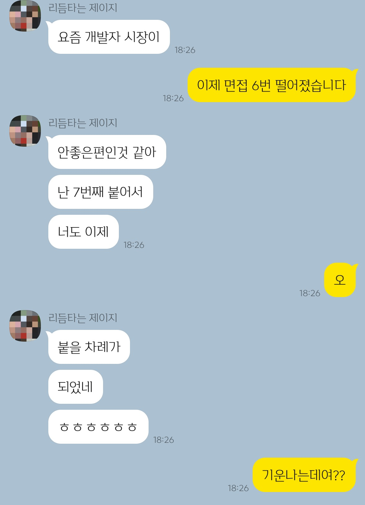 학교 다니면서 다수 경진대회 수상, 논문도 많이 써서 스펙이 어느 정도 있어서 서류통과는 쉽게 됐는데, 면접에서 계속 탈락해서 학교 선배한테 카톡 보냈었는데, 저 선배도 7번 만에 붙었다고 힘내라고 응원을 받았습니다.